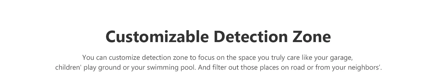 You can customize detection zone to focus on the space you truly care like your garage, children play ground or your swimming pool. And filter out those places on road or from your neighbors.